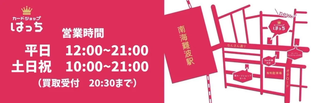 | カードショップはっち大阪日本橋店 | ![]() | 平日12:00~21:00 土日10:00~21:00 | なし | 不明 | 詳細 |