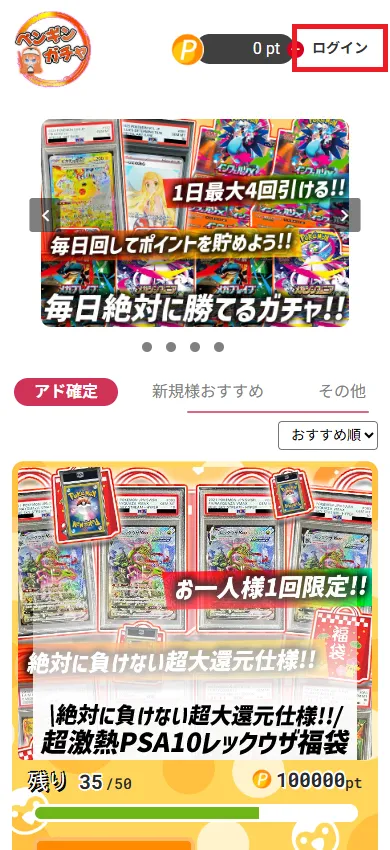 ①ペンギンガチャ公式サイトに移動後、右側上部にある『ログイン』をタップします。