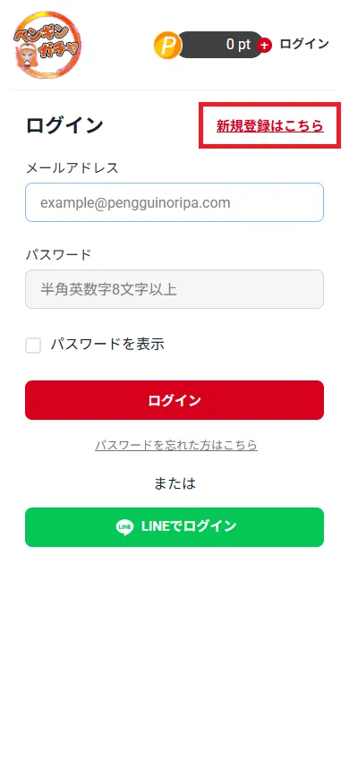 ⑤登録するメールアドレスとパスワードを入力します。ペンギンガチャから「メールアドレスを認証する」件名のメール届きます。メール『本文のメールアドレスを認証する』を選択して会員登録手続きが完了します。