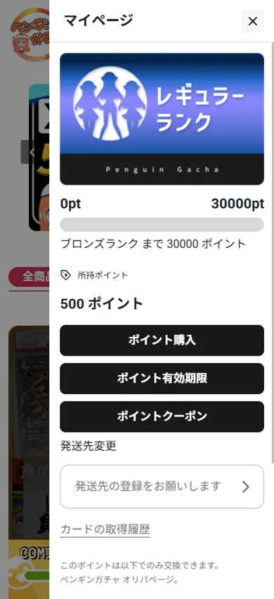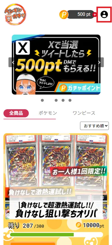 ①ペンギンガチャにログイン後、画面上部の『人型のアイコン』、または所持PT右の『 + 』をタップします。