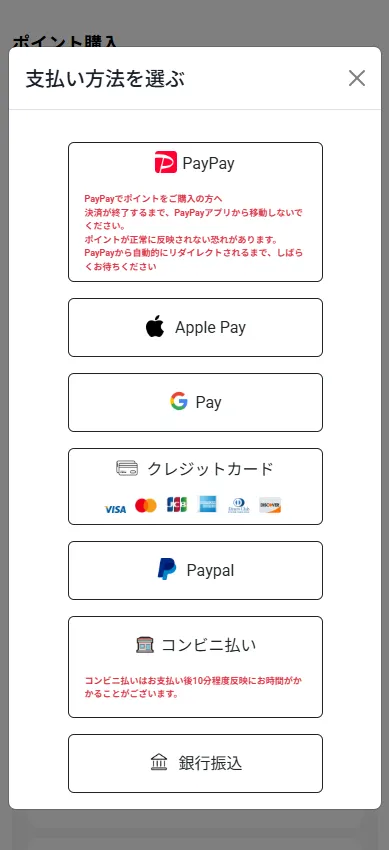 ④ご希望の支払い方法をタップします。支払い手続きを行いポイント購入が完了します。