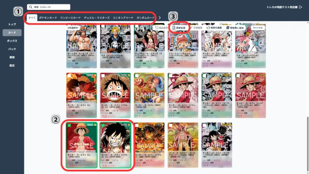 フィルター機能を使い、パック名やトレカタイトルで絞り込みを行うか、商品名検索から買取商品を検索します。買取商品の右下にある「選択する」をクリックします。クリックした商品はカードの枠が緑色に変わります。【画像②】