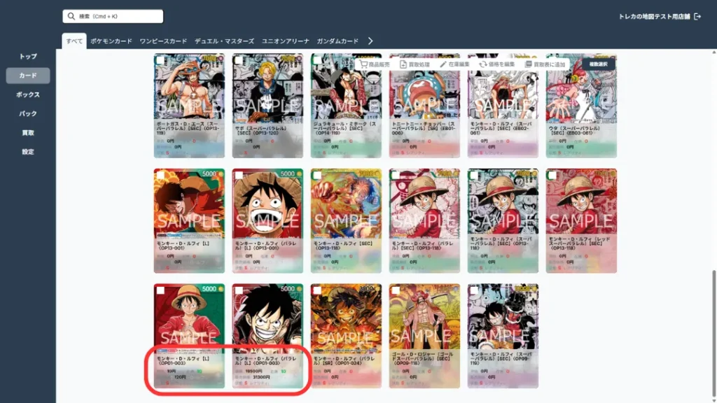 サイドメニューから、買取対象の種類(カード/ボックス/パック)を選択します。