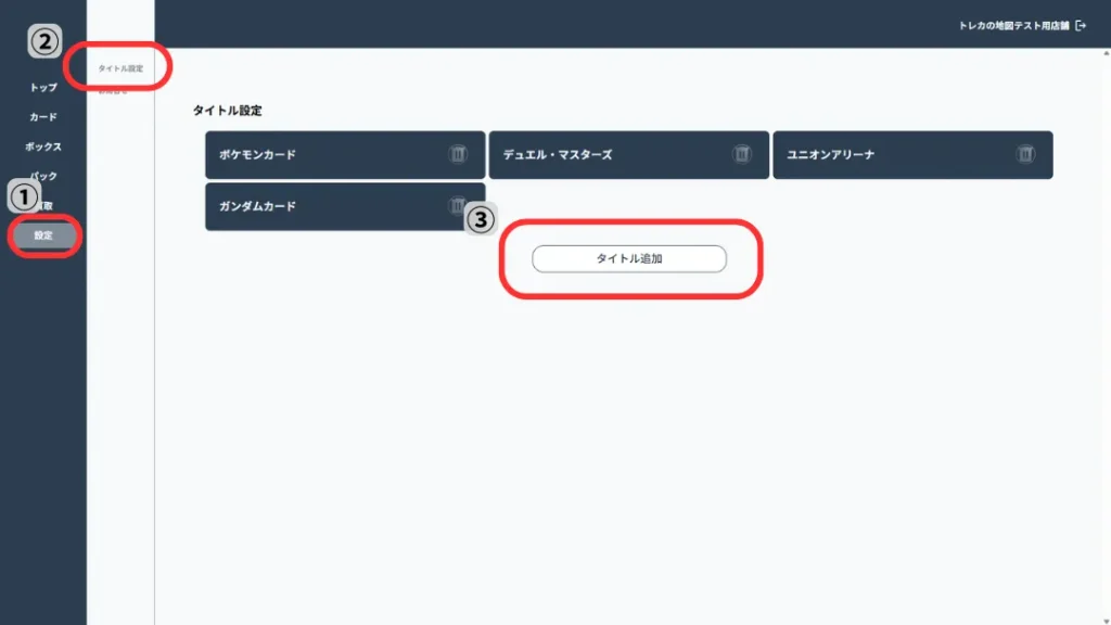 タイトル設定では、店舗で取り扱うトレーディングカードのタイトルを登録・削除できます。
