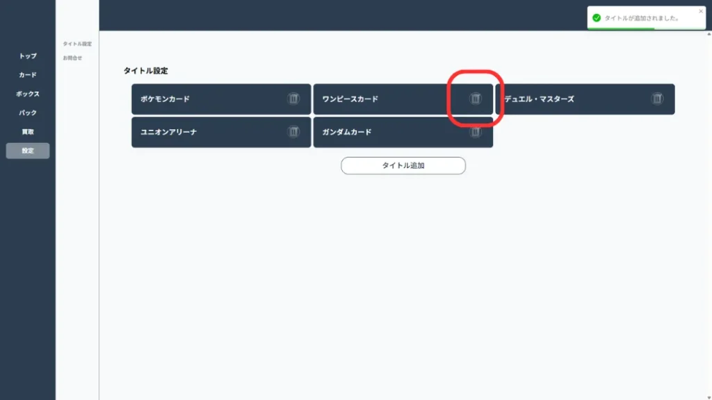 登録されているトレカタイトルを削除する場合は、タイトル右側のゴミ箱アイコンをクリックしてください。